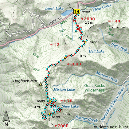 This is one of the most popular hikes in the Goat Mtn Wilderness. Having said that, only once have I met more than a couple of people while hiking to this lake. The trail head is along US Hwy 12 just a bit east of White Pass. This hike is almost entirely on the Pacific Crest Trail #2000.