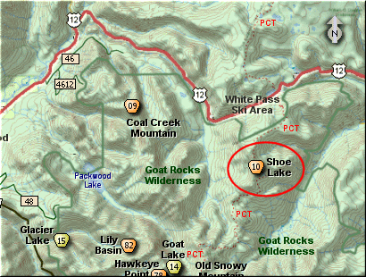 Travel east on US Hwy 12 for about 64 miles to Packwood. From Packwood travel east on US Hwy 12 for about 21 miles, and just after passing White Pass and beginning to drive downhill, you will come the Pacific Crest Trail. Bear right into the parking area for the trail, which is the trailhead for this hike.