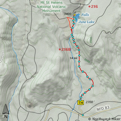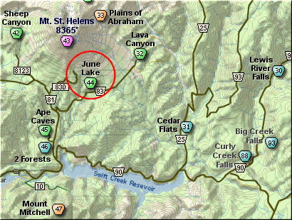 From the junction with I-5 follow SR503 east from Woodland, WA approximately 23 miles to the junction of the Lewis River Road with SR503. Continue east on the Lewis River Road another 4.4 miles to the junction of Forest Road 81 just before you get to Cougar. Continue east through Cougar on the Lewis River Road, which becomes Forest Road 90, for about 7.4 miles to the junction of Forest Roads 90 and 83. Turn left on FR83. In about 1.7 miles you will pass the road that leads to the Ape Caves, but continue north on FR83. In another 1.3 miles you will come to the junction to Forest Road 81. Continue on FR83 for another 3.8 miles you will come to the parking area for the June Lake hike.