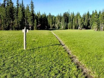 In about a half mile the trail descends into a heavily forested area and remains that way until you reach the meadow named - Indian Racetrack. It is my understanding that this meadow was used by the native American peoples for getting together during the summer and fall food gathering months. I have read that this area is referred to as a racetrack because the people could safely race on horseback.
