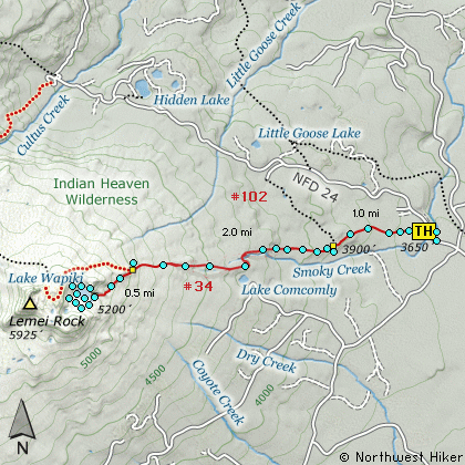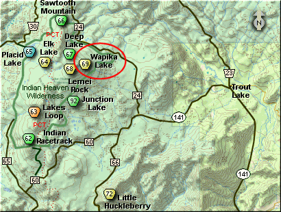 Bear left and continue on SR141 westbound out of Trout Lake for about 5.5 miles and you will cross into the Gifford Pinchot National Forest and the road changes to Forest Road 24. Continue westward on FR24 for another 2.5 miles and you will come to the junction where FR24 turns north. Turn right and continue to follow FR24 north for another 5 miles and you will pass the trailhead for Wapiki Lake and Lemei Rock.