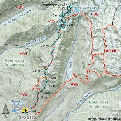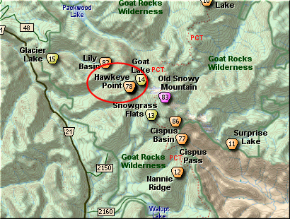 The trail to Hawkeye is the same trail and trail head to Goat Lake. It is located at the end of Forest Road #2150 near Chambers Lake. Actually, the first 5 miles of this hike are the same as the first 5 miles of the hike to Goat Lake.