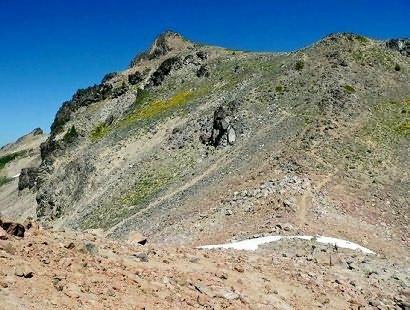 When you reach this first summit, watch carefully for mountain goats are plentiful in this area. Then desend just a bit to the pass that separates you from Hawkeye and then make the last steep climb to the top.