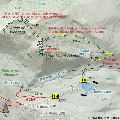 There is kinda a user's trail from the base of Little Mt. Adams over to the ridge, but even if it isn't obvious, the trek over to the ridge is basically a common sense scramble. I figure if you kinda follow the route indicated on the map, it is about a mile and a quarter to the end of the ridge, then if you just use Little Mt. Adams as a landmark, you can just walk straight back to the mountain, cutting off a bit of the original distance.