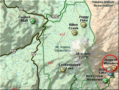 Bear right and forward onto Mt. Adams Road for about 1.3 miles and you come to the junction with Forest Road 23. Bear right and continue on Mt. Adams Road, which is also Forest Road 82, for another half mile or so, and when you come to Forest Road 80, bear again to the right and stay on FR82. To reach the Bird Creek Meadows area, just stay on FR82 for another 8.3 miles past FR80. At this point, FR82 turns into the Bureau of Indian Affairs Road 285 as well as FR8290.