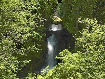 Curly Creek Falls is viewed from above the Lewis River at a viewpoint just a short walk from the parking area. In season this view is spectacular, but in late fall, Curly Creek can dry up, leaving no water in the falls.