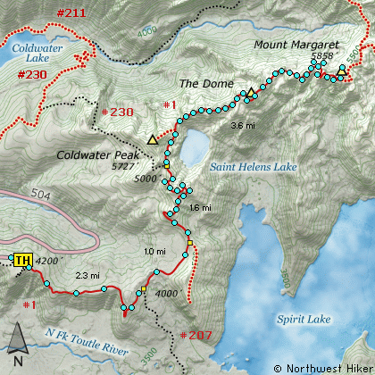 The hike follows the Boundary trail from the Johnston Ridge Observatory all the way to Mount Margaret. This is the same route to Harry's Ridge, and Coldwater Peak. So, the description is identical up to the point where the Boundary Trail leaves the junction to Coldwater Peak.