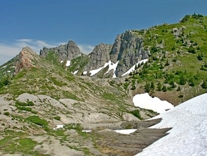 As the trail circles to the north of St. Helens Lake, you get great vistas looking back toward Mt. St. Helens and Coldwater Peak. Then eventually, the trail breaks over the ridge so you can see Mt. Whittier and Mt. Rainier rising up behind Mt. Whittier.