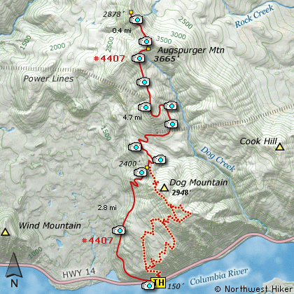 From Vancouver, WA travel east on SR14 through Stevenson, Washington to the intersection of the Wind River Highway to Carson, Washington. However, just continue east on SR14 for another 6.2 miles and you will come to the large parking area and trailheads for both the Dog Mountain and Augspurger Mountain hikes.