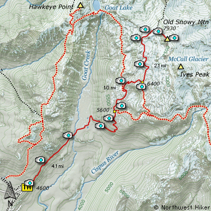 Upon reaching the PCT, you follow it north until you reach the pass on the northwest flank of Old Snowy itself. From there you follow a users trail to the top.