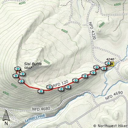 Here is an exceptional, yet easily overlooked hike, because it follows an access road to a functional fire lookout tower. Sisi Butte is a prominent shield volcano. Glaciers have carved the northeast flank and left moraines strung out to the north and east.